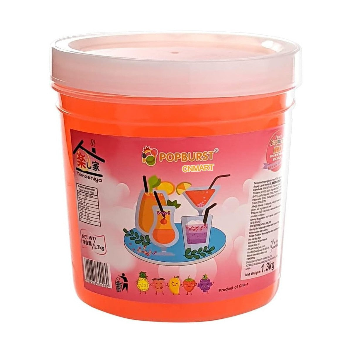 This item is Popburst Popping Boba Peach Flavour Tapioca Pearls, 1.3kg. Each pearl contains a juicy peach liquid centre that bursts in the mouth, giving a sweet and refreshing taste. Commonly added to bubble tea, smoothies, frozen yoghurt, and desserts, these ready-to-use pearls are convenient for both home kitchens and catering use. The 1.3kg pack size offers multiple servings for drinks, creative recipes, and sharing.
